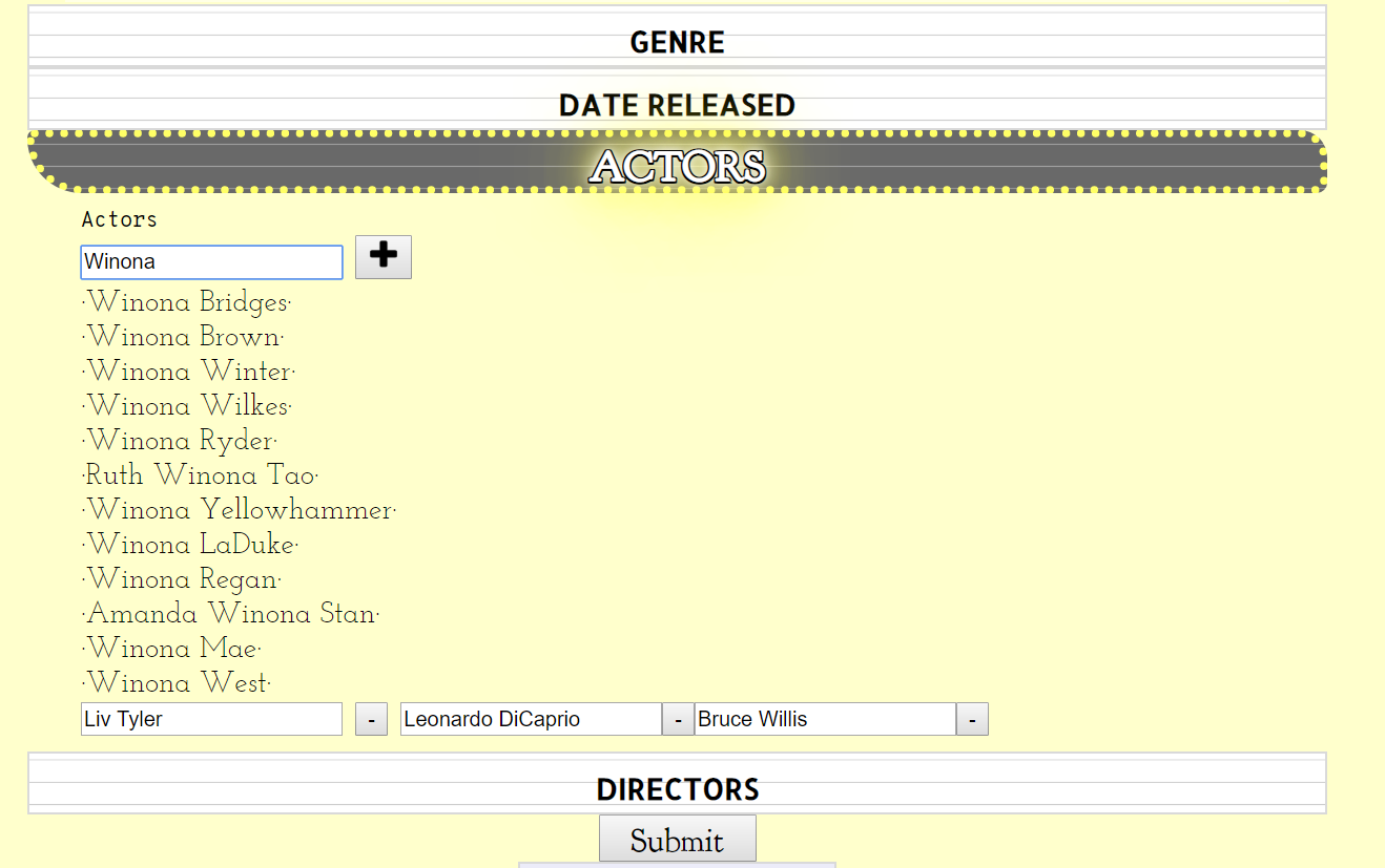 This is done by using AJAX to fetch matching actors' names from a special datatable any time the user enters a key. The user can then add as many actors names as they'd like to search for.