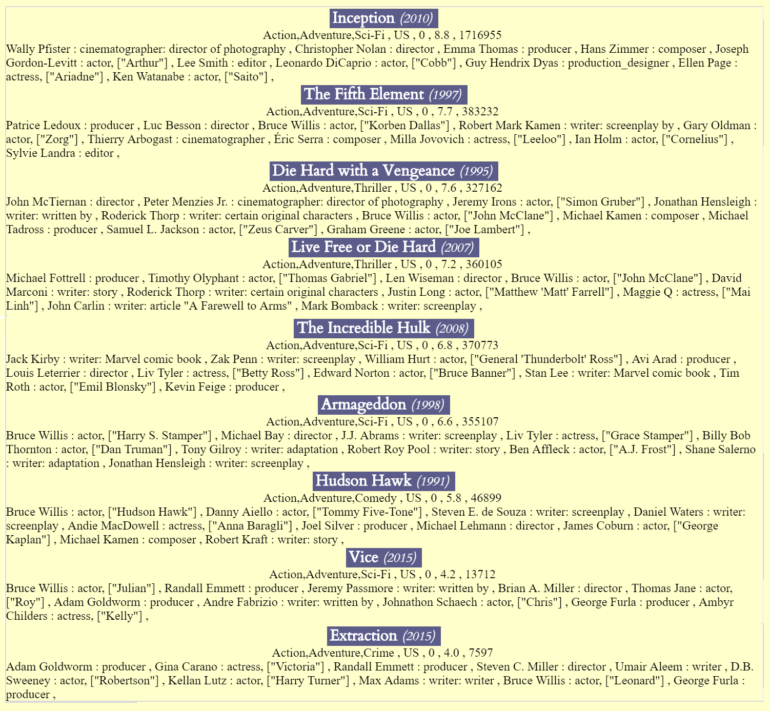 datatable is then created that holds all of the movies that fit your criteria, and the user rating range you select will determine what slice of that table you will see. So our final movie list will include any movies with Liv Tyler, Leonardo DiCaprio, Bruce Willis and Winona Ryder that are in both the Action and Adventure genres, and also have any user rating, 0 to 10.0. And here they are: