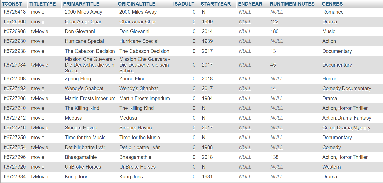 Everything started with the publically available IMDb datasets that can be accessed an downloaded by anyone. These were then altered to fit what I thought I would need. I ended up with 6 datatables: RATINGS, GENREMOVIE, REGIONS, CREW, PEOPLENAMES AND NAMES.