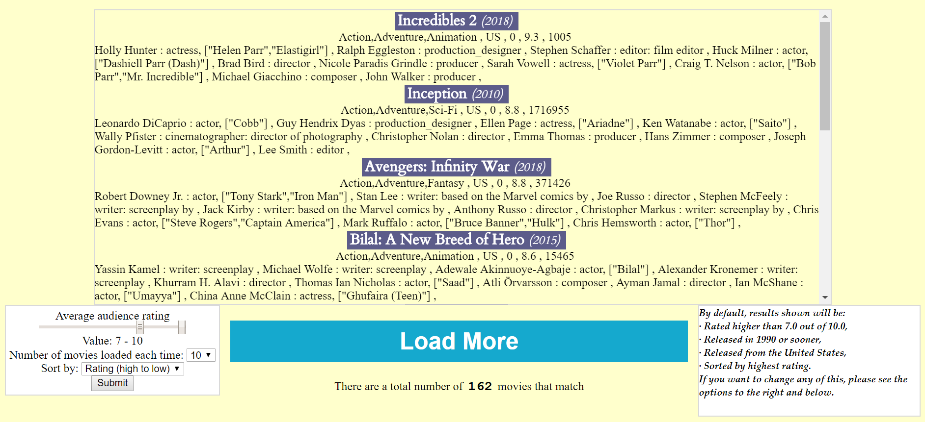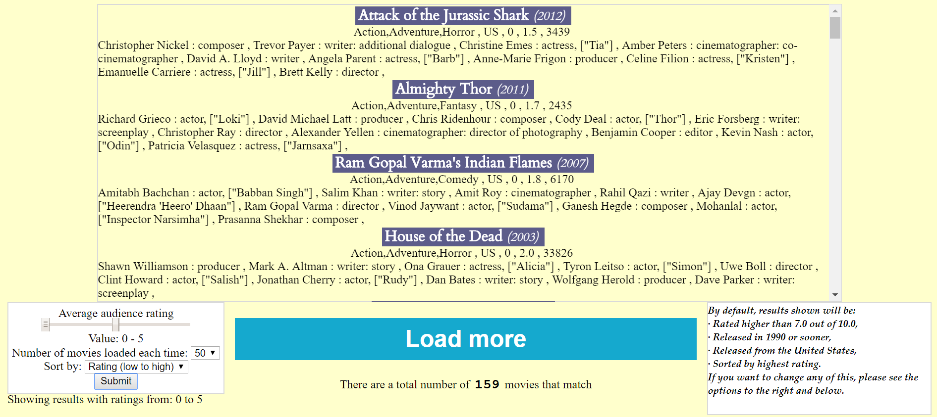 But what if the user is curious and wants to see the worst movies. They can change the ratings range to 0 to 5.0, sort by lowest rating and change the number of movies loaded to 50.