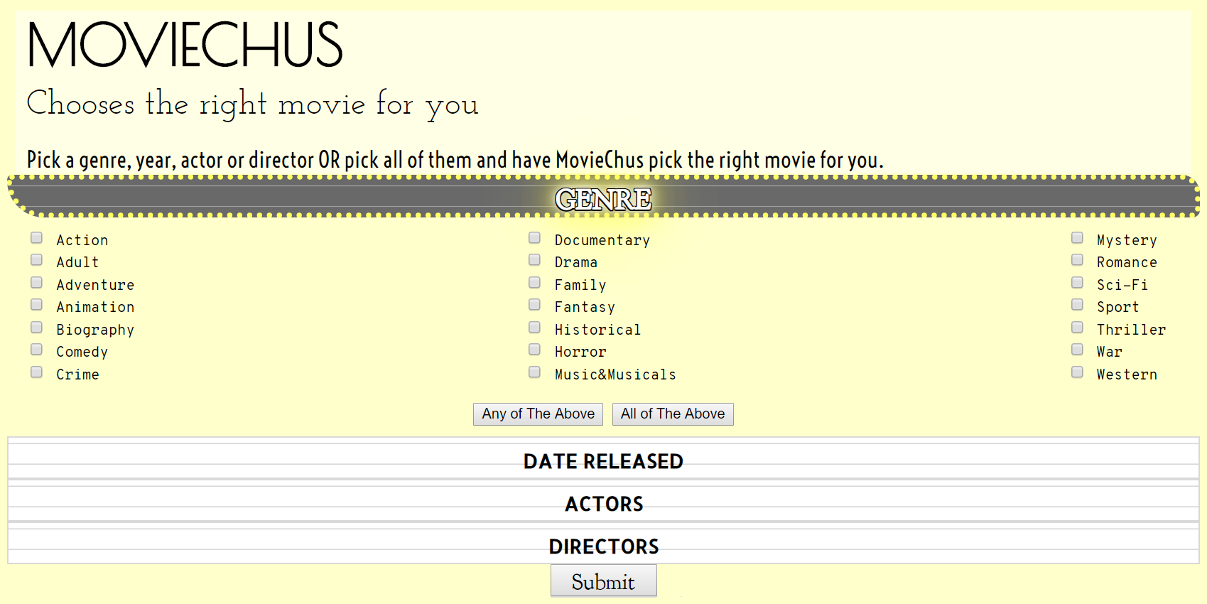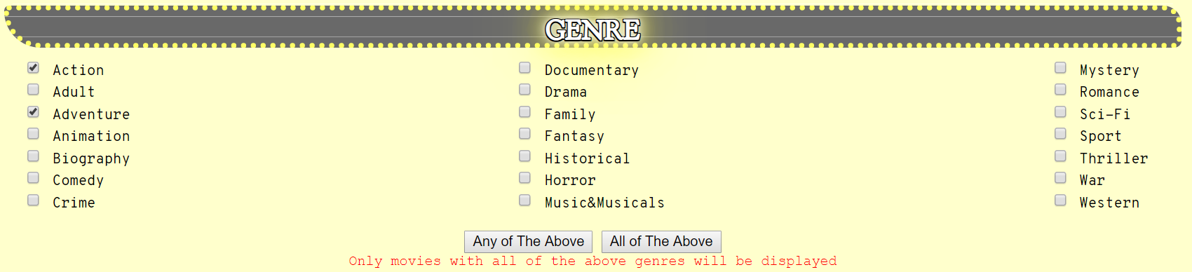 how are results will be filtered. For genre you can select whether to search for movies that have any of the genres you have selected, or to search for movies that have ALL of the genres selected.
