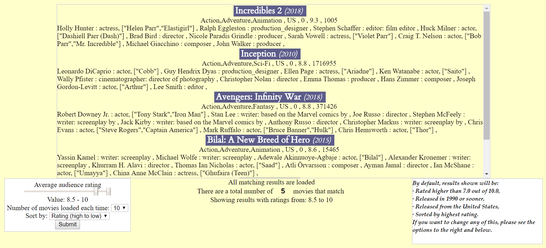 Now, if the user only wants to see the best of the best, they can change the ratings to range from 8.5 to 10.0.